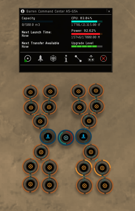 This runs two ECUs, each into two basic factories, then run those P1 goods into an advanced factory to make P2s. The dumbbell name comes from what this setup sort of looks like on most planets. At CCU 4, this will barely fit if you include a storage buffer and launchpad. You will not have PG/CPU to move your ECUs very far. You will likely have unbalanced extractor heads (4 on one ECU, 5 on another), and wildly unbalanced R0 production. If you fit a buffer storage unit for R0s and one ECU ends up producing too much, you fill your storage and you start to lose everything from both ECUs, and therefore your chain is dead, and you have to deal with a silo full of R0s.